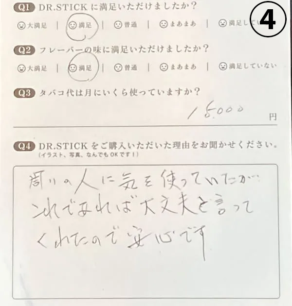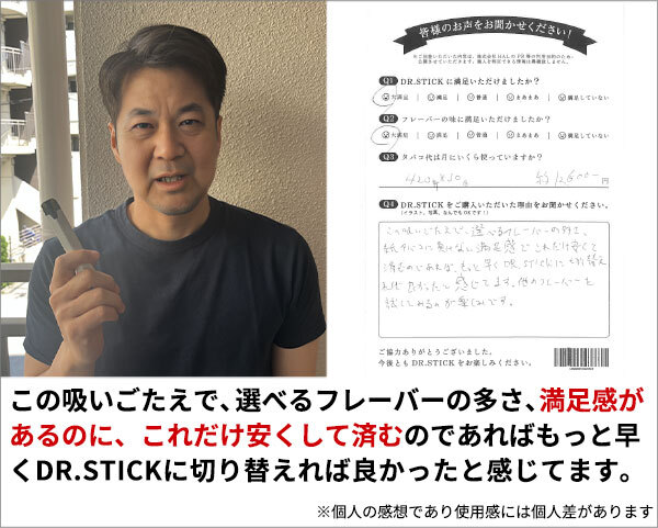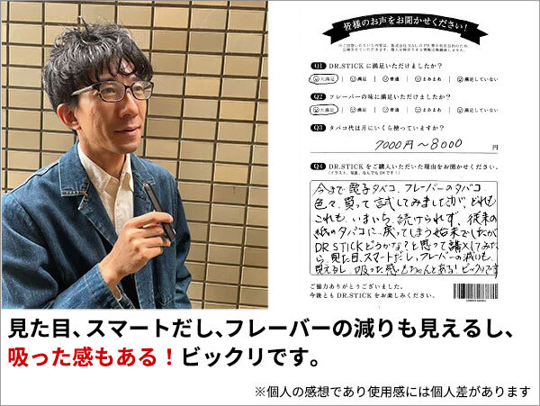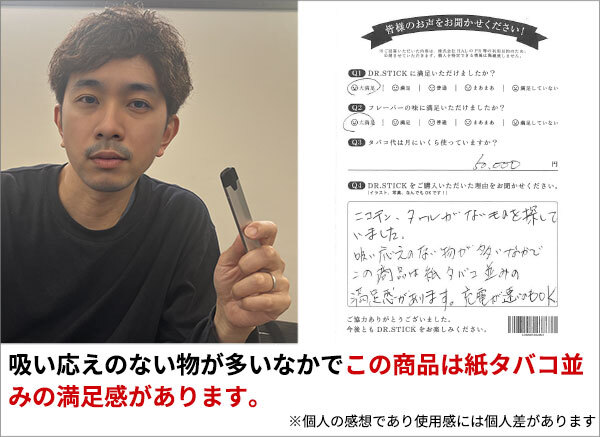 20年以上タバコを吸い続けていました!もっとカジュアルに吸えるものを探していたところ、息子に紹介されたのがDr.SticktypeXです。吸いごたえがあるので、かなり満足しています。部下からも「オシャレな電子タバコですね」と声をかけられるようになりました!笑